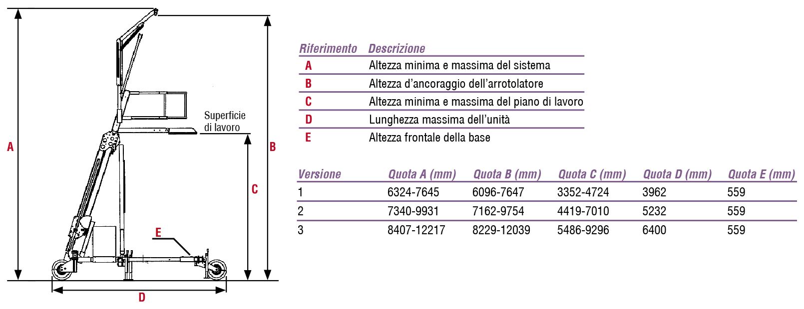 Ogni sistema è dotato di corrimano regolabile in quota, piano di lavoro antiscivolo, due verricelli ed un ancoraggio per DPI su scala.
